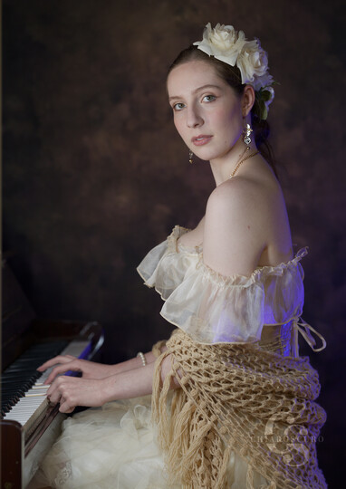 Her hair over her arms and her arms full of flowers.